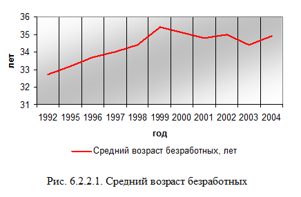Как показано на рис. 6.2.2.1, с 1992 по 1999 год средний возраст безработных имел ярко выраженную тенденцию к росту. С 1999 по 2004 год этот показатель не имеет какой-либо определенной тенденции, однако, по сравнению с 1999 годом он снизился на 0,5 года, а по сравнению с 1992 – увеличился на 2,2 года. Средний возраст безработных за 12 лет составил:
